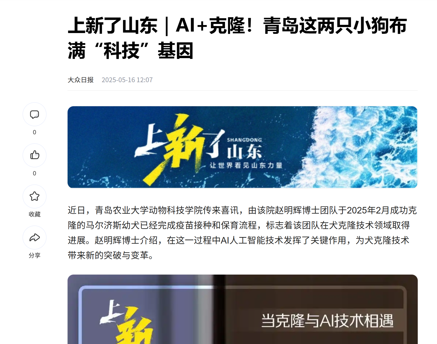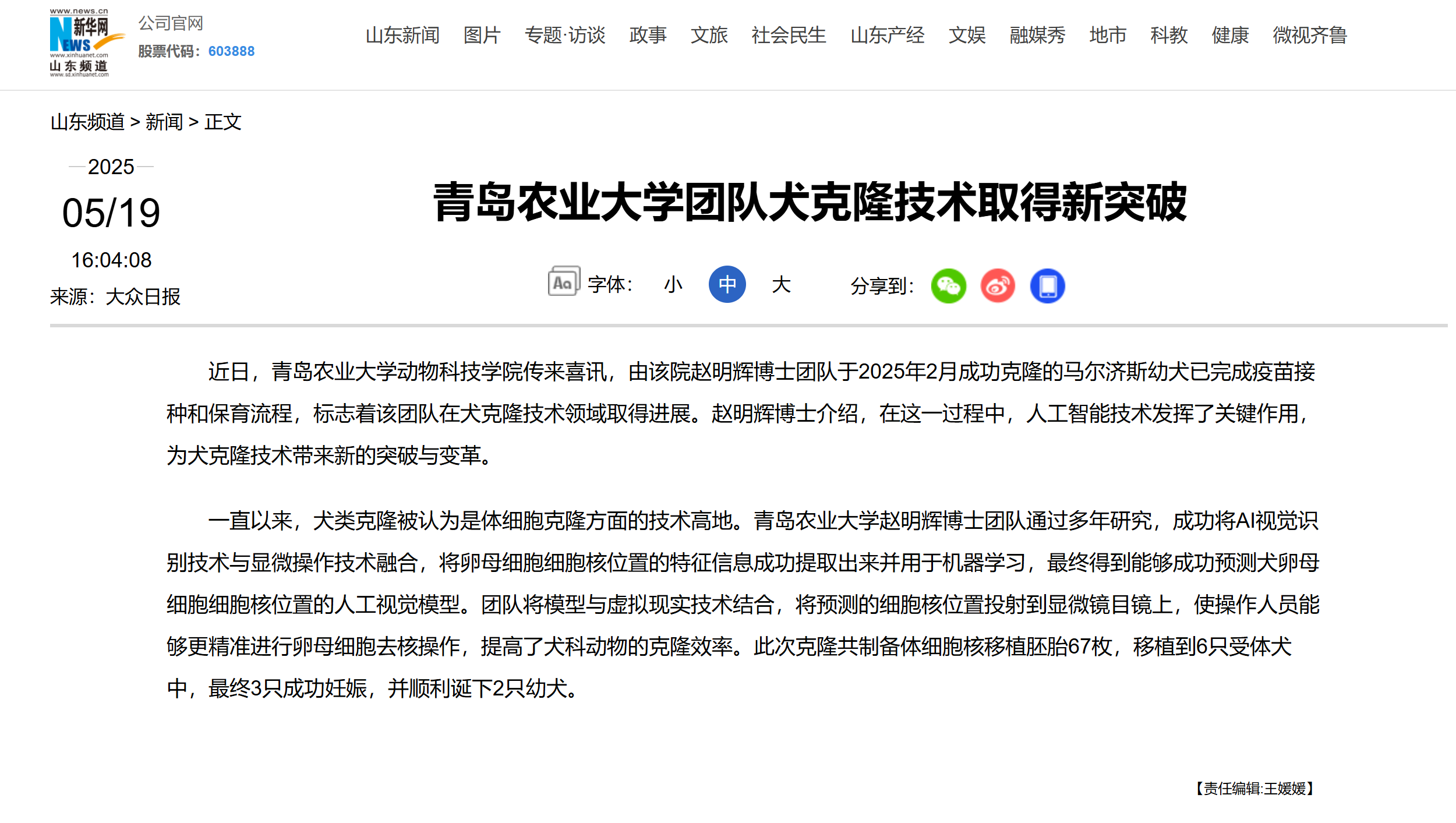 【编者按】5月16日,大众日报、新华网报道了taptap点点体彩app下载taptap点点在线下载赵明辉博士团队犬克隆技术取得新突破。