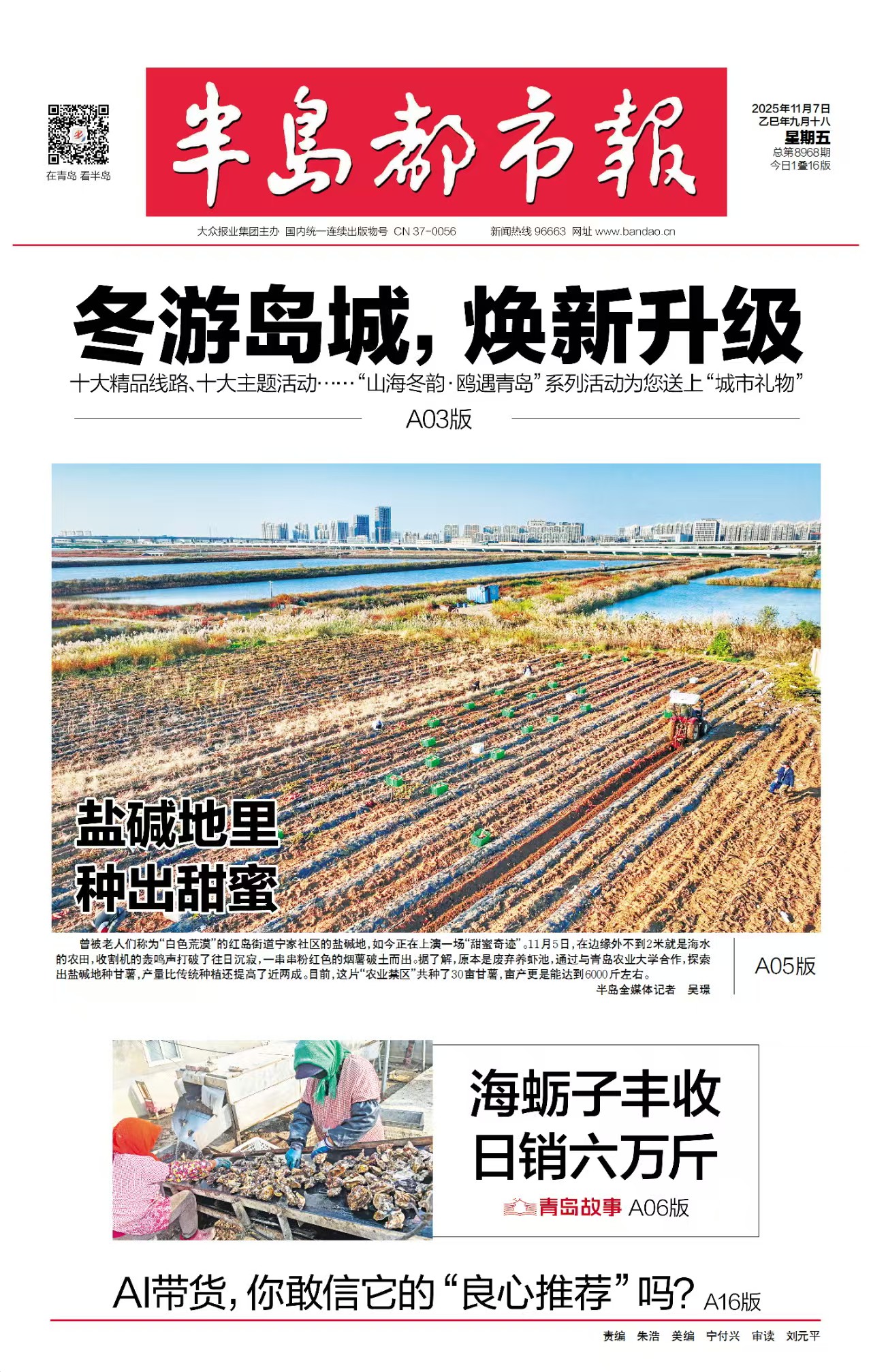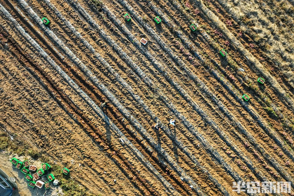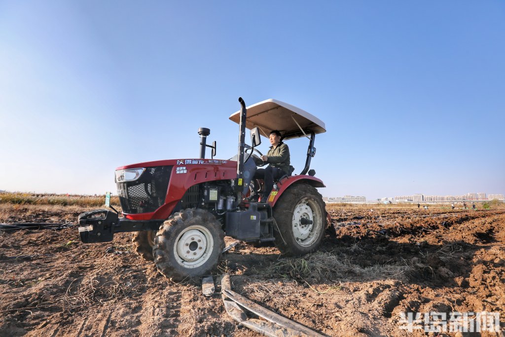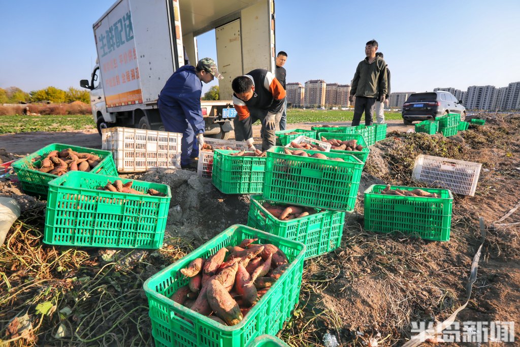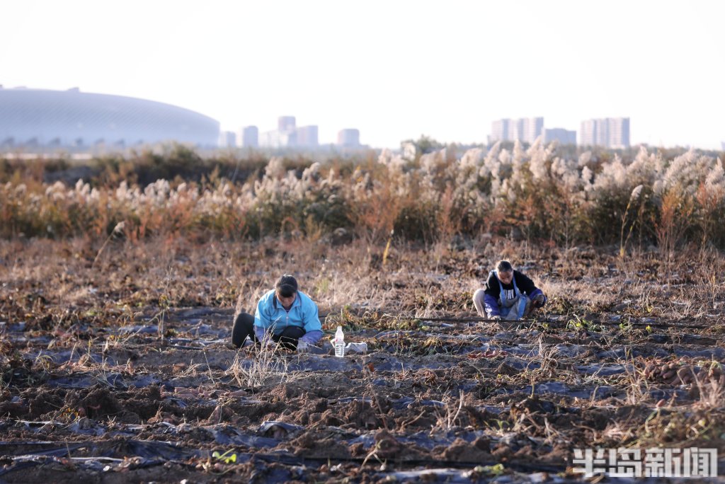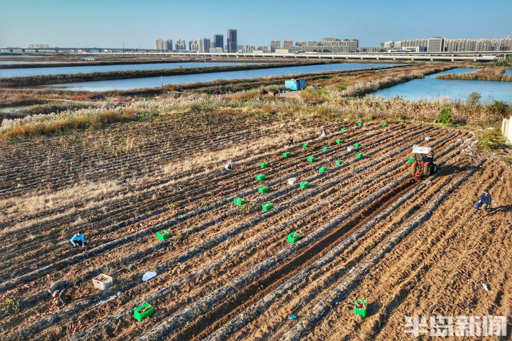 深秋的胶州湾畔,海风裹挟着咸湿的气息。青岛城阳区红岛街道宁家社区的盐碱地里,收割机的轰鸣声打破了往日的沉寂。铁齿犁开泛着碱白的土地,一串串粉红色的烟薯破土而出,在阳光下闪着湿润的光泽。工人们弯腰捡拾,身后,新翻的泥土与远处依旧板结的荒芜土地,形成刺目的对比。