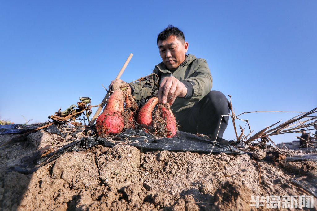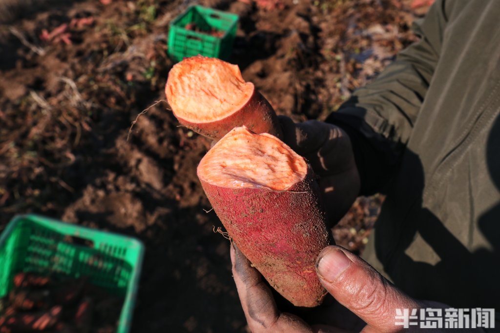 在这片毗邻海水的土地上,人们正在收获着甘甜的耐盐碱品种“烟薯25”。