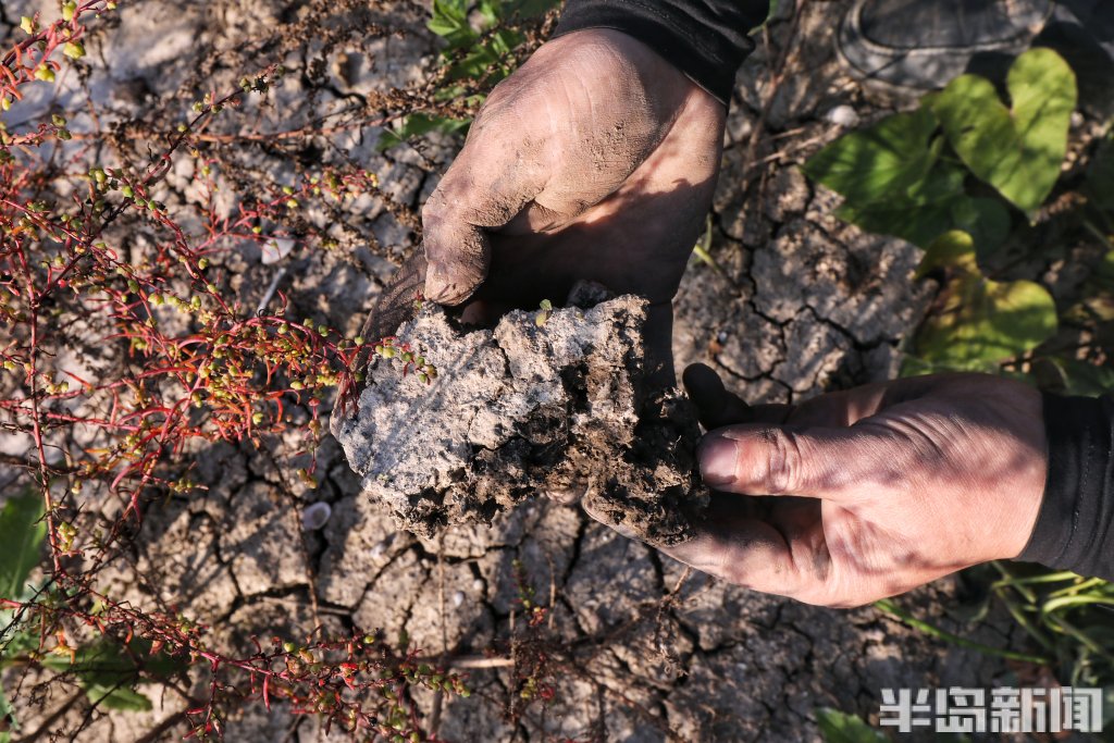11月5日,记者来到这片边缘外不到2米就是海水的农田,这是青岛市盐碱地甘薯种植的第一片试验田。“你信不信,咱们现在站的这片田往下挖1.5米就会渗出海水。可你看这长出的地瓜,却个头匀称,颜色鲜亮。”青岛供销穗初农业科技服务有限公司的张吉胜蹲在田埂上,掰开一个刚出土的烟薯,橙红色的瓤肉在阳光下格外诱人,“可别小看这些地瓜,它们是盐碱地里长出的增收希望。”