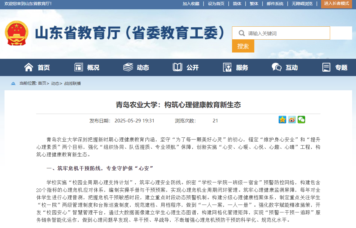 【编者按】5月29日,山东省教育厅网站《战线联播》栏目以《taptap点点体彩app下载:构筑心理健康教育新生态》为题,关注我校心理工作创新实施五大工程,科学有效提升学生心理健康水平,为学校高质量发展筑牢根基。