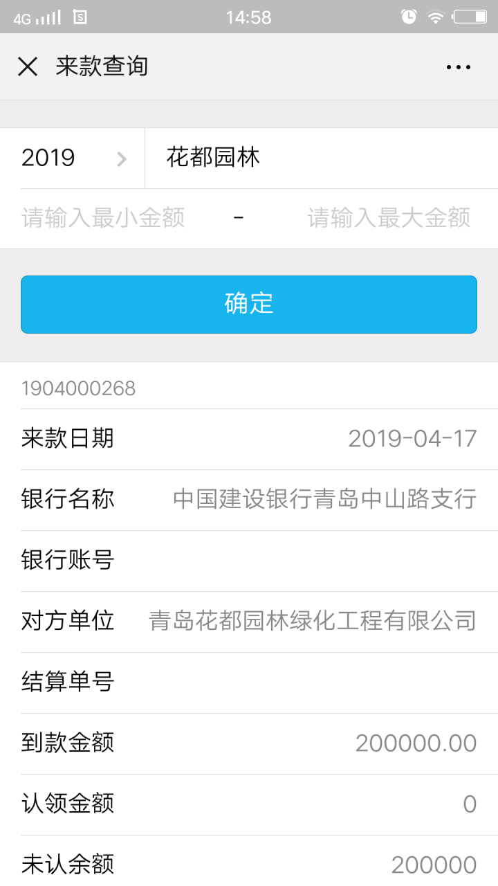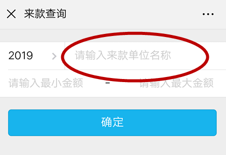 2、因为系统开发的原因,微信暂时只支持查询2019年度的数据,输入需要查找来款单位名称或其中部分关键字,如“花都园林”,点击“确定”就可以快速找到需要的来款信息。