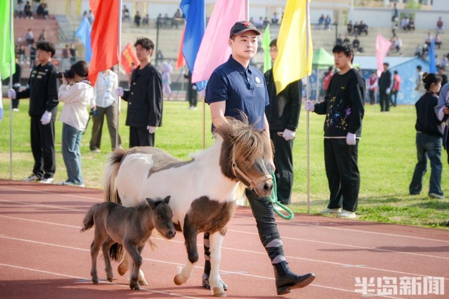 据介绍,考虑到当日运动场环境,谨慎起见没有选择展示正常体形的马匹,而是选择了矮种马。这只撒欢的小马于4月5日在莱西与学校马业科学专业合作的马场出生,才十多天大,由于太小离不开母马,也怕母马与小马分开后有焦躁情绪,所以只能将它跟父母一起带来学校“上工”。第一次出门的小马看到学校运动场上如此宽广的草坪和“宏大”场面兴奋不已,萌态百出,惹人喜爱。