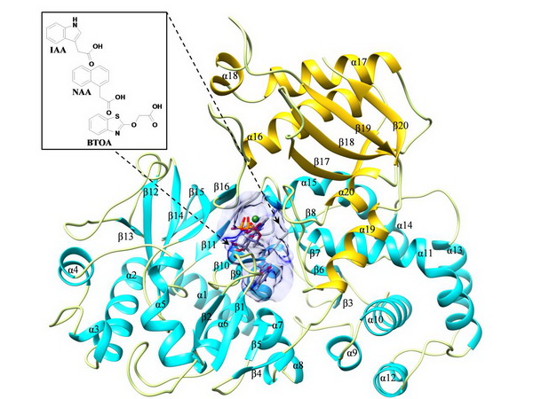 The Structural and Dynamic Basis of Acid Amido Synthetase GH3.1: An Investigation of Substrate Selectivity and Major Active Site Access Channels(Molecular Biosystems,11, 809-818.2015). Figure Legend: Auxin/IAA (Indole-3-acetic acid) plays critical rolesin many aspects of plant growth and development. Gretchen Hagen 3.1 (GH3.1) enzyme from grapevine (Vitis vinifera) catalyzes the ATP-dependent conjugation of aspartate to IAAsuggested a significant way to modulate levels of cellular auxins/IAA. It is reported that VvGH3.1 prefers IAA as substrate than 1-naphthaleneacetic acid (NAA) and benzothiazole-2-oxyacetic acid (BTOA), whereas the detailed interaction mechanism of these substrates remains unclear. In this study, based on the recently reported crystal structure of VvGH3.1 and AtGH3.12, the open form of VvGH3.1 was built. Then combined computational techniques were utilized to investigate bindingmechanism of three substrates, IAA, NAAand BTOA, and dynamicbehaviors of GH3.1induced bysubstratebinding.