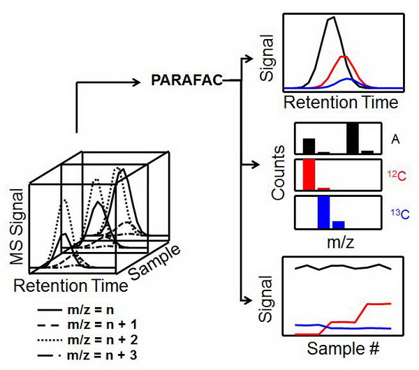 Comprehensive discovery of 13C labeled metabolomics in the bacterium Methylobacterium extorquens AM1 using gas chromatography mass spectrometry (Journal of Chromatogaphy A, 2013, 1317:175-85). This collaborative project has been carried out by Qingdao International Center on Microbes Utilizing Biogas in the School of Life Science and Department of Microbiology at the University of Washington. Figure Legend:Data analysis procedure: replicate chromatographic runs as a function of the experimental design are stacked in parallel to create a cube of data with a separation time dimension, mass spectral dimension, and sample number dimension. PARAFAC is applied, utilizing the sufficiently trilinear data structure to accurately deconvolute separate individual analyte contributions.