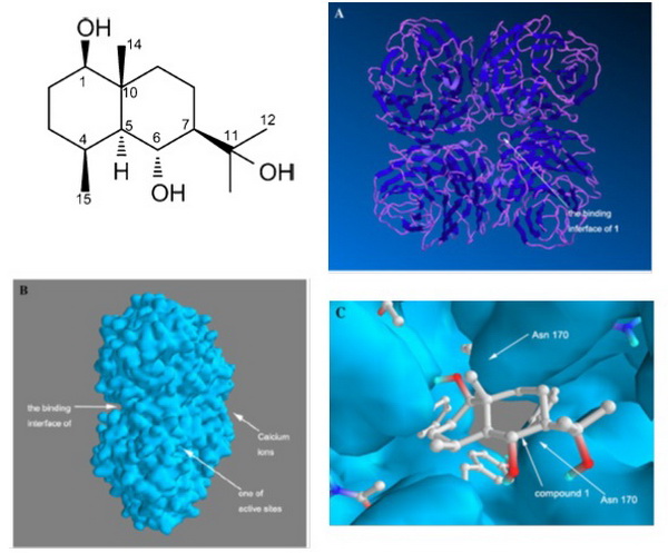 Discovery of a new sesquiterpenoid from Phellinus ignariuswith antiviral activity against influenza virus (Archives of Virology2014, 159(4):753-60.) Figure Legend:The binding interface of a new sesquiterpenoid with NA. A. Molecular mode of NA was showed in ribbon and the view was down the 4-fold axis form above. B. Calcium ions ligands sites and binding interfaces of compound 1 with NA. C. A zoom of molecular surface of NA showed the detail of compound 1 binding with NA.