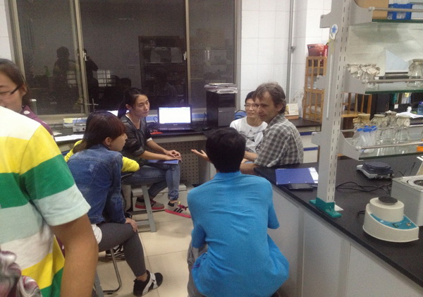 Dr. Martin Sadilek at the University of Washington visited the School of Life Science in 2014. Dr. Sadilek was discussing the experimental designs of proteomics and metabolomics with the students in Qingdao International Center on Microbes Utilizing Biogas.