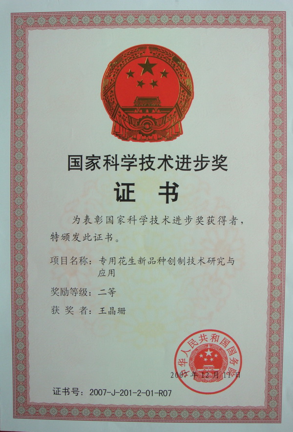 The project of research and application of innovation technology on newly special peanut varieties led by Professor Jing-shan Wang and her team won the National Prize for Progress in Science and Technology, second prize. The State Council of the People's Republic of China, 200712, Grant No: 2007-J-201-2-01-R07.