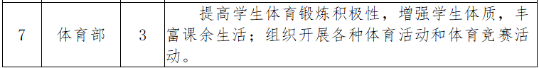 (6)体育部:设部长1名,副部长2名,部门职责为:负责组织院级体育赛事,丰富同学们的日常生活,强化学生体质锻炼,塑造崇尚体育、热爱运动的良好风气,打造多支学院体育运动队伍,提高同学参与到体育活动当中的积极性。
