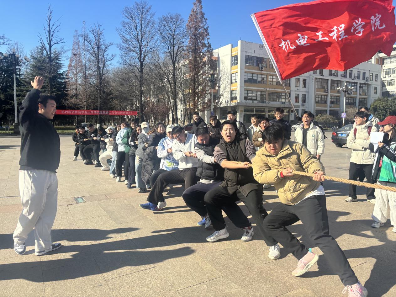 寒风凛冽,呐喊如潮。机电工程学院的队员们紧扣长绳,鞋底蹬地,身体后仰,绷成一张张蓄满力的弓,在一声声整齐的号子中凝聚成向后倾轧的力量洪流,红绸在界线间几度拉锯,终被他们稳扎的脚步一寸寸拖向胜利。多次激战,多次凯歌,终场哨声响彻冬日的天空,他们以全胜之姿昂首立于赛场中央,掌心是被绳索烙下的集体印记,眼中是汗水洗亮的锋芒。绳索落地,喝彩震天,他们用最原始的力量语言,写下了属于机电工程学院的铁血篇章。