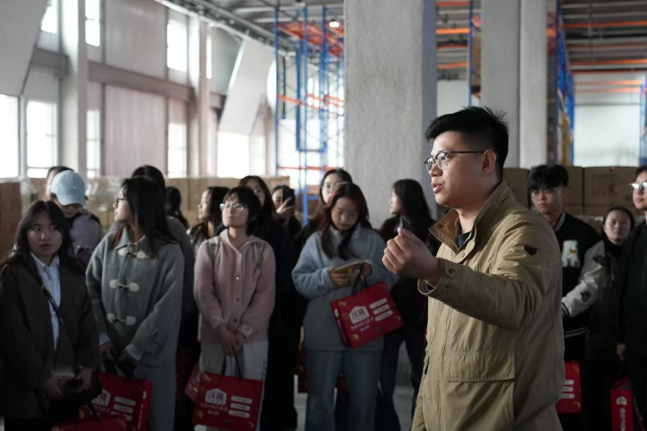 仓库肖主管带领师生走进占地8000㎡的智慧仓,电动叉车穿梭于15米高的立体货架间,不同规格的坚果产品通过智能分拣系统精准归类。当得知该仓峰值吞吐量达每日14万件时,老师们点评道:“这正是《供应链管理》课程中JIT(准时制生产)理论的鲜活案例。”