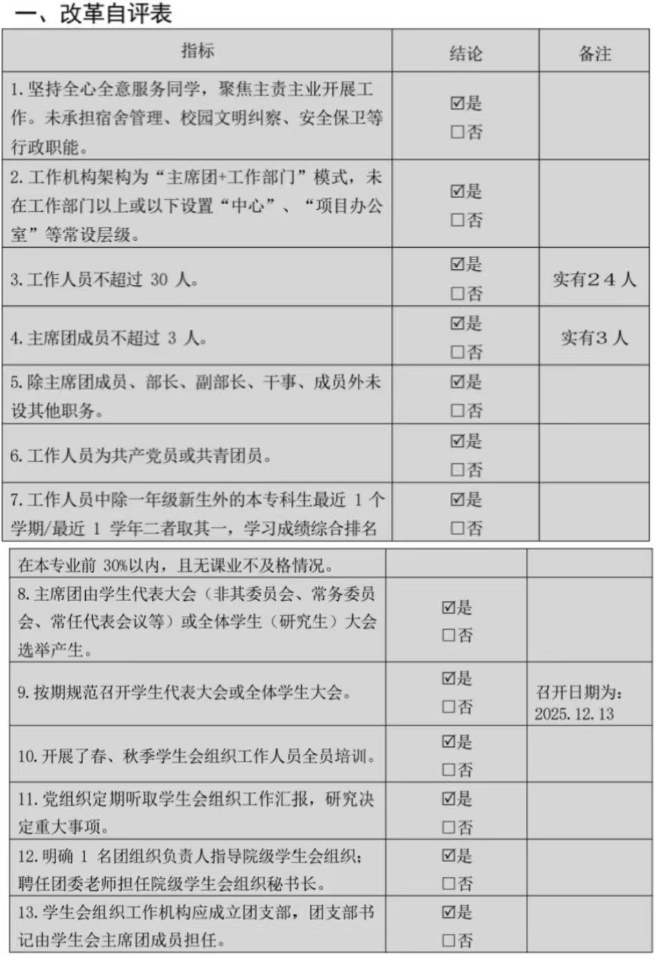 为落实共青团中央、教育部、全国学联联合下发的《关于推动高校学生会(研究生会)深化改革的若干意见》,并结合《关于巩固高校学生会(研究生会)改革成果的若干措施》文件要求,接受广大师生监督,现将我院 2025 年度学生会改革情况公开如下。