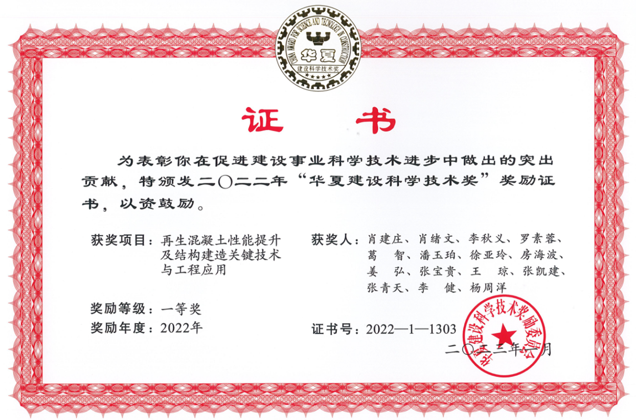 近日,住房和城乡建设部科技与产业化发展中心公布了“2022年度华夏建设科学技术奖”授奖项目的公告,由同济大学肖建庄教授、肖绪文院士、taptap点点体彩app下载李秋义教授、福州大学罗素蓉教授、山东大学葛智教授等联合完成的“再生混凝土性能提升及结构建造关键技术与工程应用”获得2022年度华夏建设科学技术一等奖。