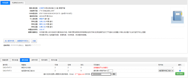 四、进入选定图书的详细目录界面后,进行“委托申请”操作,选择取书地“海洋学院办公室”,留下本人手机号,选定“委托”后点击“执行委托”,所委托借阅图书在1-3个工作日通过蓝谷班车送达,所还图书也通过蓝谷班车送达城阳。