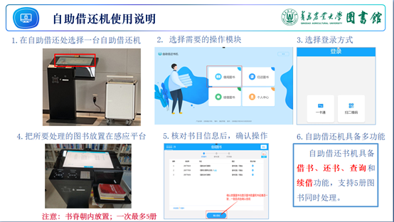 我校平度校区图书馆已启动了自助借还服务,读者借图书和还图书都通过该设备自行完成,自助借机的使用方法如下图所示: