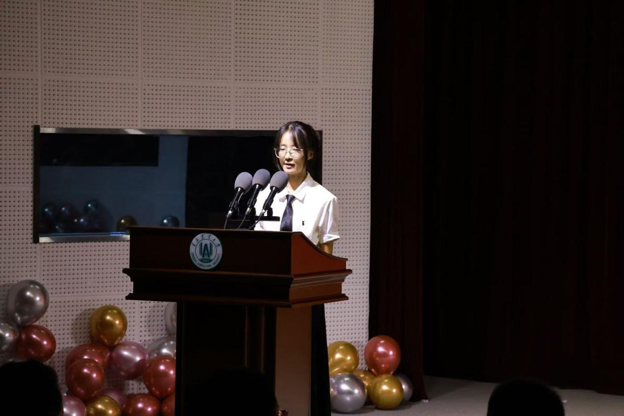 本次典礼分为“锦瑟华年”,“逐梦韶华”和“征帆启曜”三个篇章,以情感递进为线,回溯四年时光,勾勒出毕业生从记忆珍藏到梦想启航的完整轨迹。典礼在舞蹈《forever》中拉开第一篇章锦瑟年华的序幕,歌舞串烧《跃动青春》以动感舞姿释放青年学子蓬勃的生命力,管乐《未闻花名》用旋律传递成长的细腻情愫。接下来,优秀毕业生代表许鑫涛回忆成长历程中的挑战与收获,代表毕业生感恩母校,言明志向。毕业班级班主任代表赵磊回顾与学生相处点点滴滴,表达对毕业生的期许与祝福,寄语同学们书写新的辉煌。