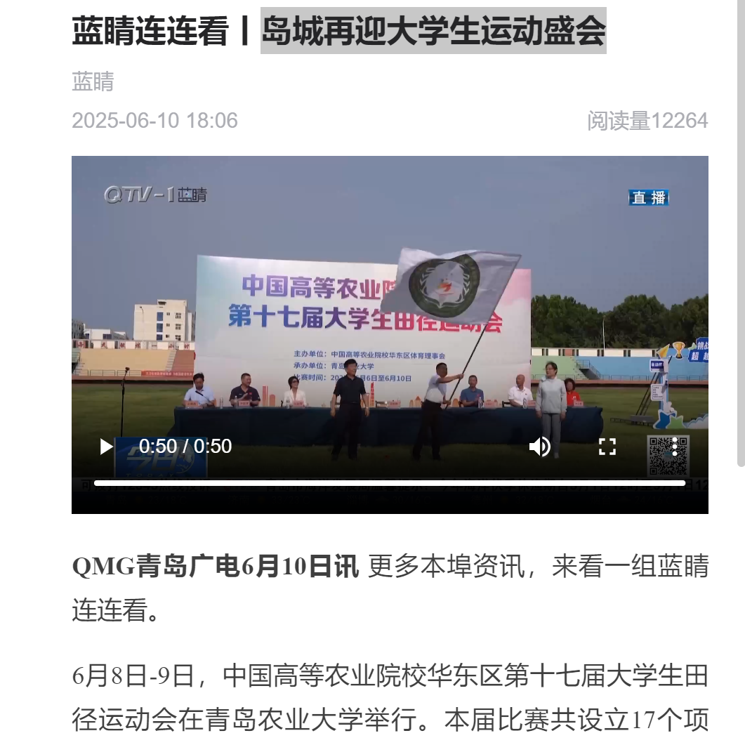 【编者按】6月10日青岛电视台“今日”和蓝睛客户端以《岛城再迎大学生运动盛会》为题报道了中国高等农业院校华东区第十七届大学生田径运动会在taptap点点体彩app下载举行。