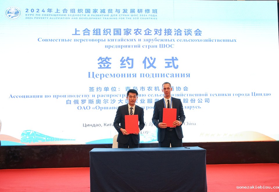 会上,研修班学员与中方企业代表还进行了面对面深入交流与产品品鉴,现场气氛热烈,就产品进出口、技术交流、互派专家访问等方面达成了多项共识。其中,白俄罗斯奥尔沙大区农业服务开放式股份公司与青岛市农机流通协会,白俄罗斯奥尔沙大区“马雅克·维索伽耶”开放式股份公司与青岛福生食品有限公司,分别进行合作意向现场签约。