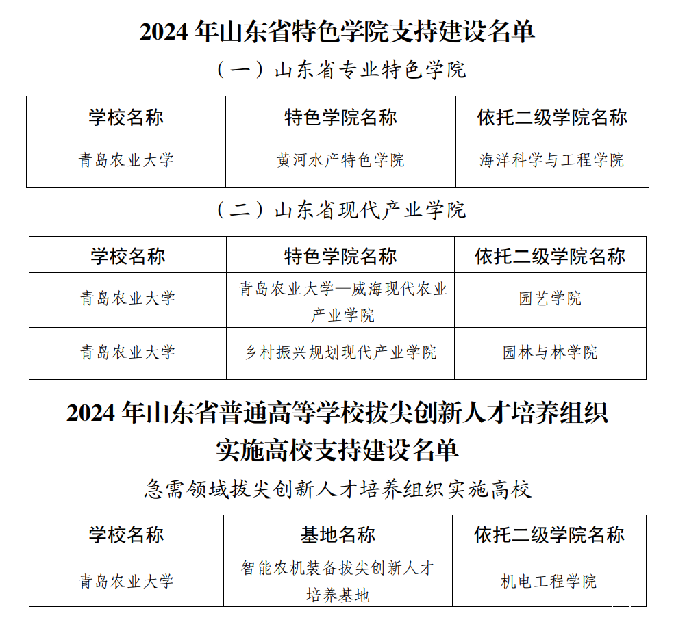 获批项目中,海洋科学与工程学院建设的“黄河水产特色学院”获批山东省专业特色学院;园艺学院建设的“taptap点点体彩app下载-威海现代农业产业学院”获批山东省现代产业学院;园林与林学院建设的“乡村振兴规划现代产业学院”获批山东省现代产业学院;基于机电工程学院“智能农机装备拔尖创新人才培养基地”建设,学校入选山东省普通高等学校急需领域拔尖创新人才培养组织实施高校。