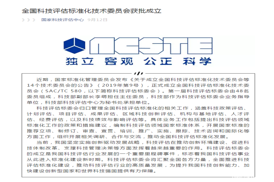 当前,我国坚定实施创新驱动发展战略,科技评估在推动创新环境建设、促进科技体制改革、支撑科技管理决策等方面发挥着越来越重要的作用。科技评估标委会的成立是我国科技评估行业发展的一个重要里程碑事件,标志着我国科技评估事业从此进入标准化建设新时期。