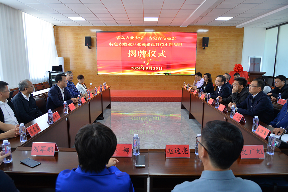 揭牌仪式前,与会领导调研了学校支持内蒙古财鑫集团共同建设的甜糯玉米生产车间、支持山东海星新媒体有限公司在当地建设的奈曼特色农牧业电商直播平台,详细了解运营情况和发展需求。调研组一行还参观了学校在当地所开展项目的部分成果展。由我校特种食品研究院以当地牛羊肉、甜糯玉米、藜麦、沙棘、鸡心果等为原料开发创制的各类特色食品、饮品等,以及学校在当地盐碱地上示范种植收获的甘薯、黎麦、大豆、高粱、花生等农产品,受到与会专家的一致好评。